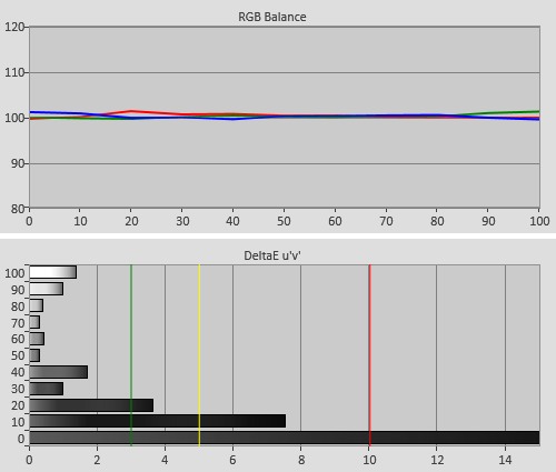 Погрешности передачи цвета снизились до уровня менее 3 (что принято считать заметным уровнем для человеческого глаза), начиная с 30 % уровня яркости экрана, но ниже этого значения некоторые неточности остались, которые, вероятно, и можно было бы исправить при наличии в этом телевизоре Sony дополнительного 10-ти точечного регулятора баланса белого.