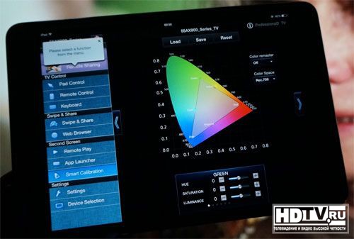 Во-первых, любые корректировки, сделанные с помощью приложения (известного как VIERA Remote App) будут применяться только к пользовательским режимам просмотра вместо более точных "профессиональных" режимов, которые не только имеют выключенные по умолчанию чрезвычайно точные возможности настройки изображения, но также выделяются плоской характеристикой гаммы уже при заводских настройках. Во-вторых, корректировки приходится делать с помощью сенсорных ползунковых регуляторов, что представляет некоторые проблемы, особенно на дисплеях таких небольших устройств, как iPad Mini или iPhone, когда требовалась более точная подстройка.