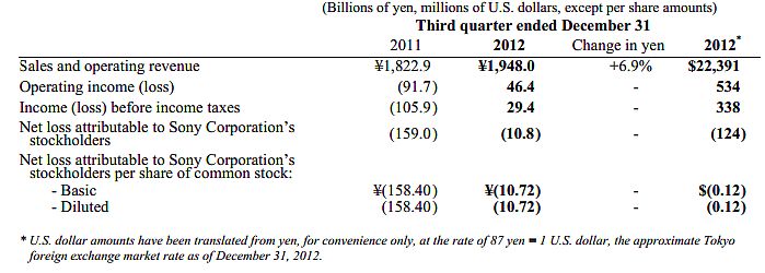 С тех пор как новый президент Kaz Hirai взял в свои руки вожжи управления и запустил план реструктуризации "One Sony" повозка Sony начала медленно менять курс. И пусть пока нет явных финансовых успехов, но объемы продаж в целом увеличились. Sony добилась улучшений в своих финансах, согласно последним данным ежеквартального отчета Sony. В четвертом квартале 2012 года объем продаж и операционных доходов достиг $22,4 млрд., увеличившись на 6,9 процента по сравнению с аналогичным периодом прошлого года. И, хотя чистый убыток составил $124 млн, это огромное изменение в сравнении с $1,7 млрд. потерь прошлого года.