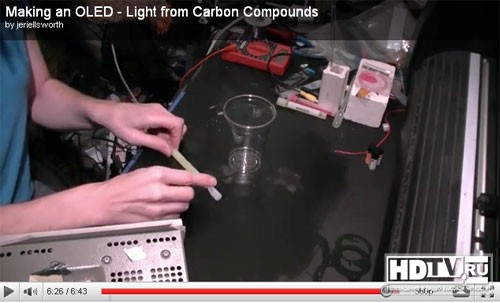 Джери Эллсворт, американский предприниматель, инженер-самоучка, разработчик компьютерных чипов объясняет «на пальцах» как работает OLED экран и демонстрирует в своей любительской лаборатории эксперимент по созданию OLED источника.