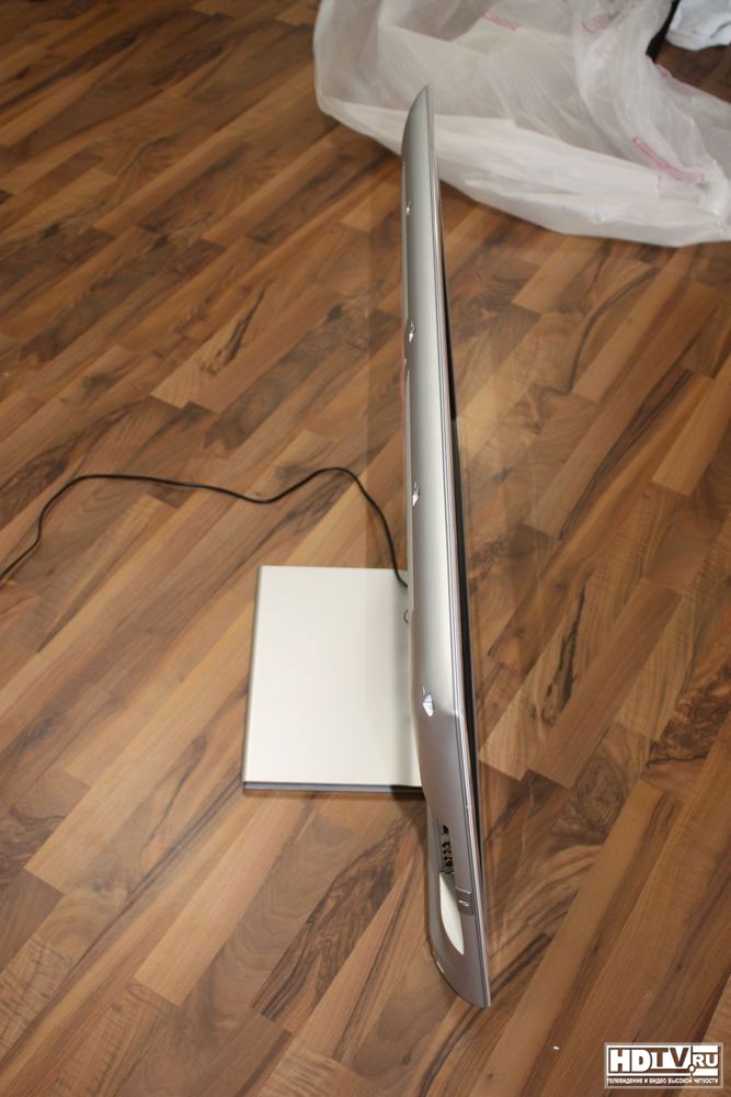 Экранная рамка выполнена из глянцевого пластика, корпус достаточно тонкий, как и подобает для LCD телевизора с боковой LED подсветкой.