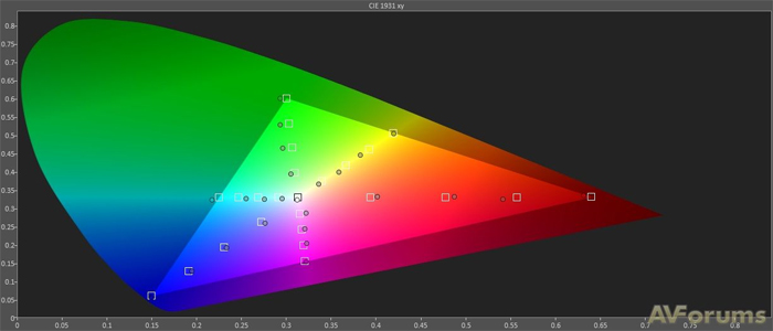 Как и ожидалось, мы смогли получить плоскую кривую шкалы серого, благодаря отличным регуляторам, хотя, другие были не столь хороши, чтобы сделать то же самое для цветового пространства. И все же, регуляторы вполне самодостаточны и грех на них жаловаться. Погрешности Delta были на незначительном уровне и, конечно, значительно ниже "безопасного" уровня 3, когда человеческий глаз не может различить любую дисгармонию в цветопередаче. Как и шкала серого, при типичной яркости изображения цветопередача была близка к безупречной, с несколько неточной насыщенностью красного, но заметной только для очень наметанного глаза.