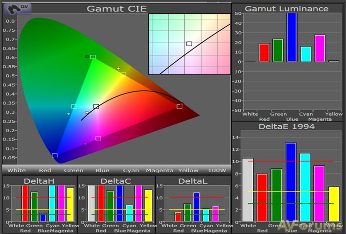 Измерения выполнялись в режиме изображения по умолчанию - Стандарт. Как видно из графика баланса первичных цветов (шкала серого), слишком много синего в оттенках серого и, гамма-кривая напоминает букву S, так что картинка не только выцветшая, но и беленая в слишком ярких областях и слишком темная в темных частях экрана. С точки зрения соблюдения цветовых стандартов Rec.709, используемых при производстве контента для HDTV, заводские настройки далеки от идеала. Как первичные (красный / зеленый / синий), так и вторичные (голубой / пурпурный / желтый) цвета или перенасыщены, или слишком яркие, или дают оттенок, или обладают комбинацией всех трех недостатков, и то что мы видим на экране не соответствует задумке создателей контента.