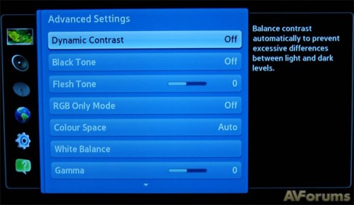 Среди дополнительных настроек имеется Черный тон, который позволяет изменять уровень яркости, но лучше оставить эту опцию отключенной. Есть Динамическая контрастность, необходимый при калибровке регулятор общей гаммы. Expert Pattern предоставляет несколько тестовых шаблонов для настройки встроенного тюнера и режима RGB, позволяя отдельно отображать каждый из трех первичных цветов, что полезно для проверки корректности декодирования цвета. Среди дополнительных настроек есть опция называемая Цветовое пространство, которая позволяет выбирать между Auto, Native и Custom. При выборе пользовательского режима (Custom) становится доступной система управления цветом, которая позволяет выполнить калибровку воспроизводимой цветовой гаммы. Очень точную калибровку шкалы серого должны обеспечить 2-х или 10-ти точечные регуляторы баланса белого.