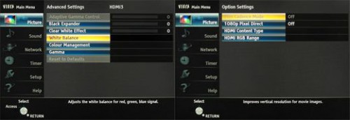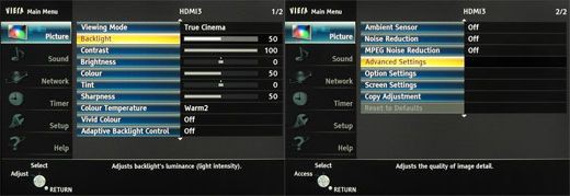 Меню изображение включает ряд позитивных усовершенствований. Во-первых, это давно назревшее включение отдельного регулятора подсветки [Backlight], который позволяет нам регулировать общую яркость LED подсветки, что должно быть чрезвычайно полезно для Panasonic Viera E6 в особо динамичных сюжетах.