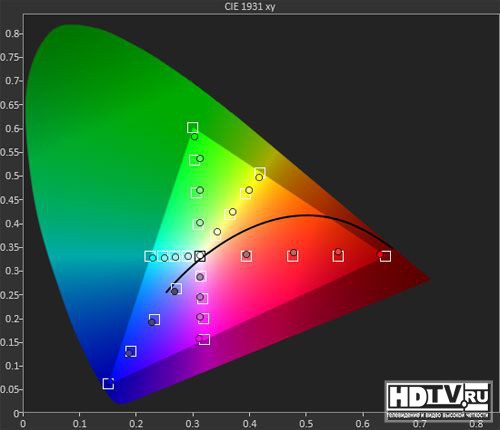 Полученный после калибровки график весьма хорош, сравним с лучшими, когда-либо виденными нами, результатами на любом из дисплеев. 10-точечный регулятор баланса белого и регулятор гаммы в тестируемом телевизоре были довольно точны, мы выполняли относительно большие корректировки (например, +5 или -5) до видимых и ощутимых изменений на экране.