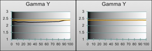 До калибровки гамма-кривая проходила скорее ближе к уровню 2.2, чем к уровню 2.4, который рекомендован МСЭ (Международный союз электросвязи) для настройки плоско панельных телевизоров для условий темной комнаты. Используя 10-точечный регулятор мы оперативно выставили максимально плоскую гамма-кривую, приблизив ее к уровню 2.4.