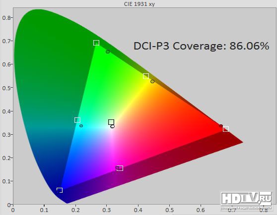 Последнее обновление программного обеспечения Calman SpectraCal теперь позволяет при тестировании дисплеев измерять цветовую гамму в пределах любого стандарта цветового пространства. Оказалось, что с [Цветовой гаммой] в значении "Широкая", 4K OLED телевизор LG EG960 воспроизводит до 86% цветовой палитры стандарта DCI-P3, что представляет вероятную цель в ближайшем будущем для UHD телевизоров с WCG (расширенной цветовой гаммой), в сравнении с более амбициозным, но менее практичным стандартом Rec. 2020.