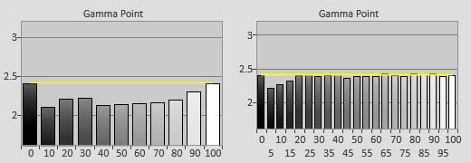 Уровень гаммы 2.4 рекомендован МСЭ (Международный союз электросвязи) в качестве рекомендуемой EOTF (электро-оптический передаточной функции) для HDTV, используемых в затемненной комнате для просмотра соответствующего этим требованиям контента. Установка уровня гаммы «2.4» привела нас к этой цели, но при этом мы нашли детали в тенях недостаточно четкими. К счастью, используя 20-точный регулятор «Баланса белого» в качестве регулятора гаммы, мы могли поднять детализацию в тенях, понизив уровень гаммы в почти черной зоне до 2.1 и 2.2, сохраняя высокий уровень 2.4 для полутонов и ярких деталей.