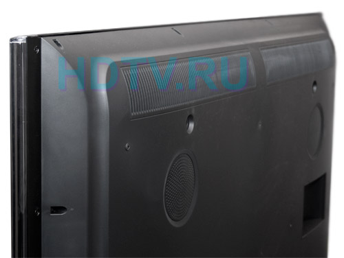 В углублении тыловой панели телевизора находится основной блок коммутации. Здесь есть всё, что может пригодиться пользователю аппарата: компонентный вход, два SCART (RGB) и два интерфейса HDMI, по которым передается аудиосигнал (стерео) и видеопоток вплоть до 1080p. Поддерживается режим 1080p/24 frame.