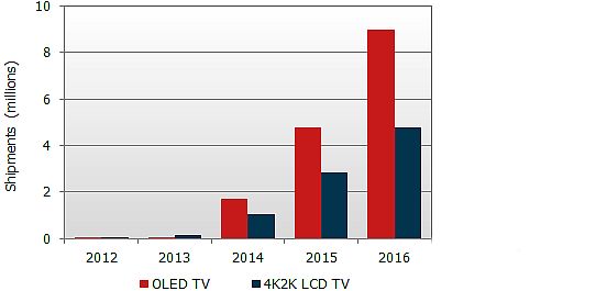 К 2016 году ожидается выпуск 9 миллионов OLED телевизоров в год. И, судя по этому же прогнозу, гораздо хуже обстоят дела с внедрением телевизоров повышенного до UHD разрешения. В этом году их продадут 4000 штук, в следующем 154 000.