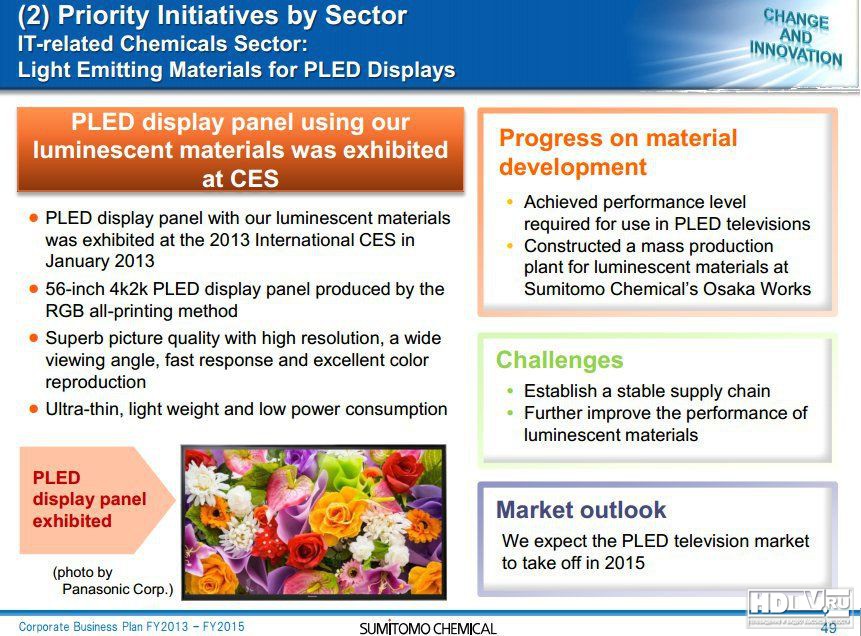 Недавно компания Sumitomo Chemical представила свой план производства на 2013-1015 годы, из которого стало ясно, что именно эта компания была поставщиком OLED материалов для OLED панели впервые представленного на выставке CES 2013 56-дюймового 4K (3840 × 2160) телевизора Panasonic.