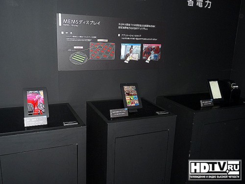 На выставке Sharp показала три 7-дюймовых MEMS дисплея, с разрешением 800 х 1280 и плотностью около 220 ppi. Sharp разработала эти три дисплея в сотрудничестве с американской Qualcomm, которая заинтересована в промышленном выпуске подобных дисплеев и выступила спонсором разработки промышленного процесса на основе передовых технологий Sharp.