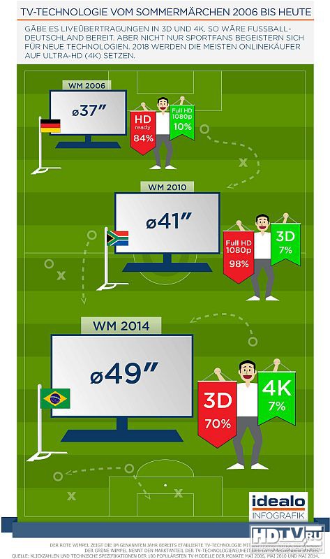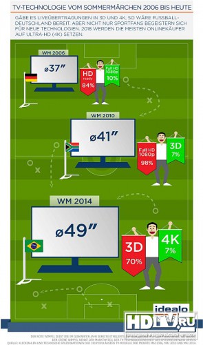 К чемпионату мира 2014 в Бразилии доля 3D телевизоров уже поднялись на 70%. Размер экрана сделал еще один значительный шаг - до 49 дюймов. 4K телевизоры начинают свое распространение с 7% доли в этом году. Судя по некоторым прогнозам, к чемпионату мира по футболу 2018 года 55-дюймовые Ultra HD телевизоры станут достаточно распространенными моделями.